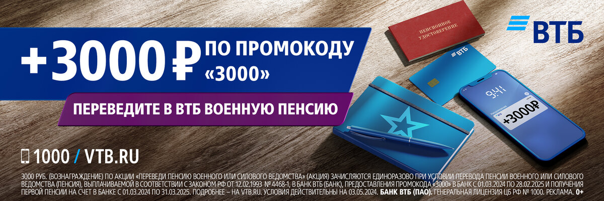 3000 рублей могут получить как те, кто уже получает пенсию от военного или силового ведомства, так и те, кто только собирается выйти на заслуженный отдых. Предложение действует, если вы не получали военную пенсию в ВТБ с 1 марта 2023 года по 29 февраля 2024 года.